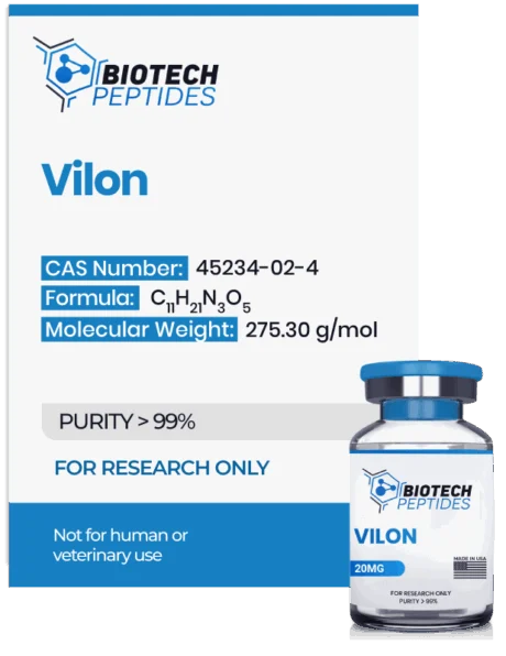 Vilon (or Lyslglutamic Acid) is a peptide with apparent immunomodulatory and anti-aging bioregulation potential. It is a short peptide with just two amino acids in length. Scientific research suggests it may potentially act to regulate the vascular system and encourage hemostasis. Its functions may be more widespread, with studies indicating its possible influence in reducing the prevalence and growth of spontaneous tumors. Advocate researchers like Dr. Vladimir Anisimov believe that the peptide may become more widespread in contemporary research within the context of geroprotection.